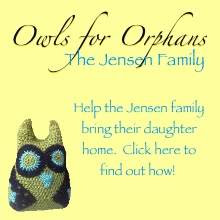 Owls for Orphans Blog Amy is a mom, and amazing owl maker. She started this as a fundraiser for her own adoption. (She and her husband just got back from visiting their soon to be six year old daughter who just happens to be in the same country as Sofi). She then decided to feature families each month and fundraise for them. The most awesome part of this in my mind is that if you don't want to buy an owl for yourself, you can buy an owl for orphans. Whoever is traveling that month will take owls purchased for orphans to the orphanage. This is a quote from her blog: